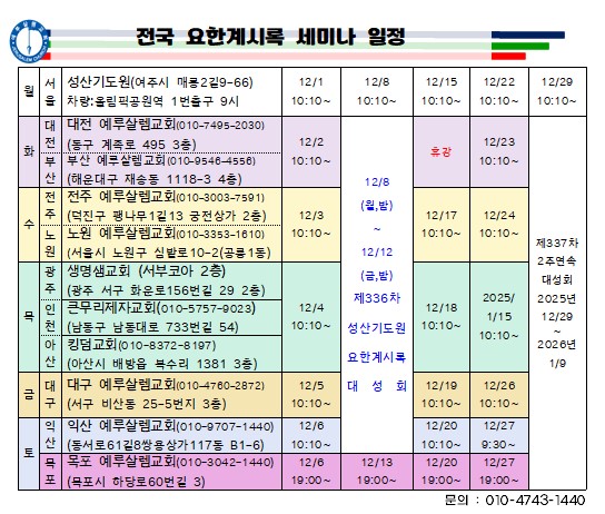 | 59 | 12월 전국 요한계시록 세미나 일정 image | 128 | 2025년 12월 1일 |